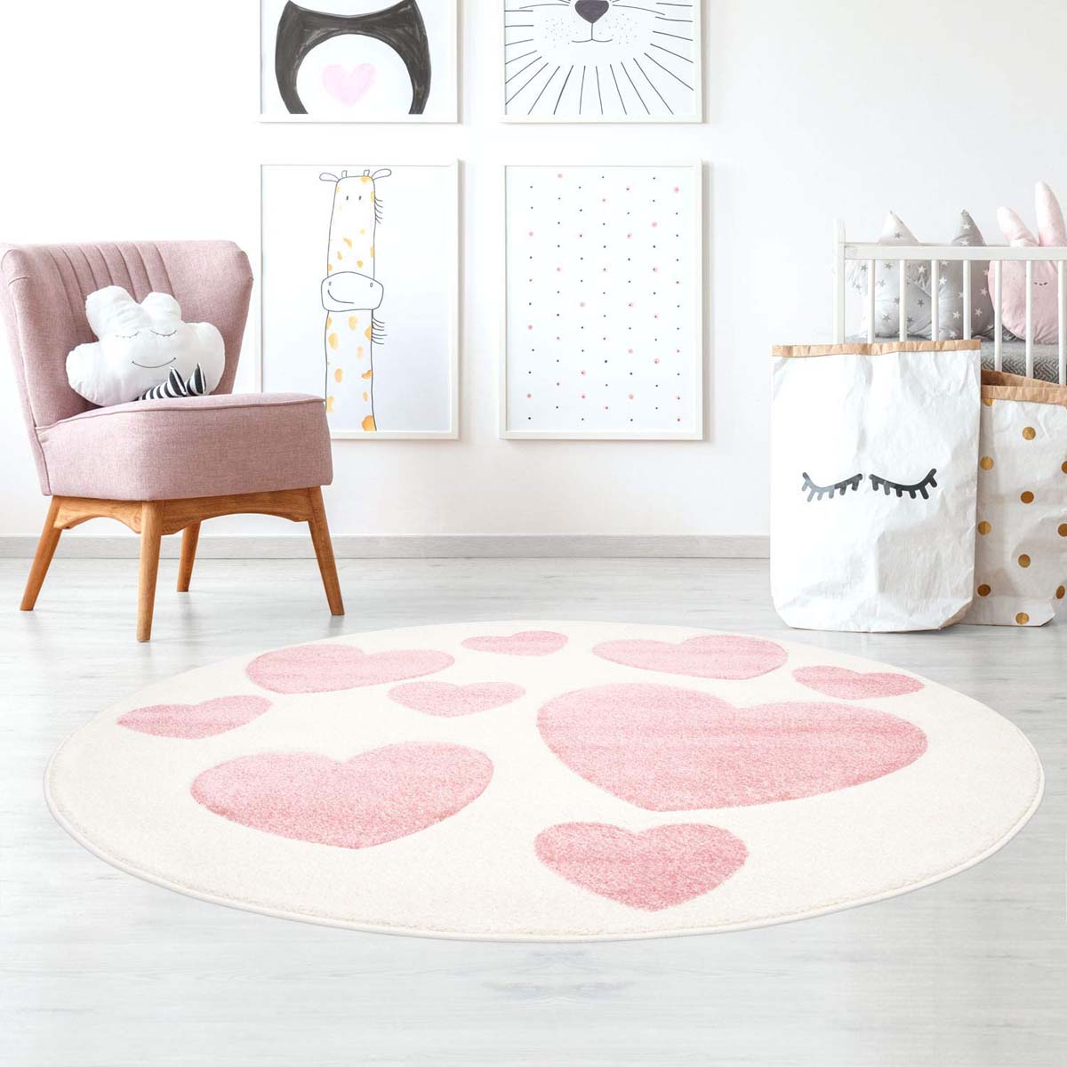 Tappeto bambini con cuori rotondo – Amie crema/rosa -36%