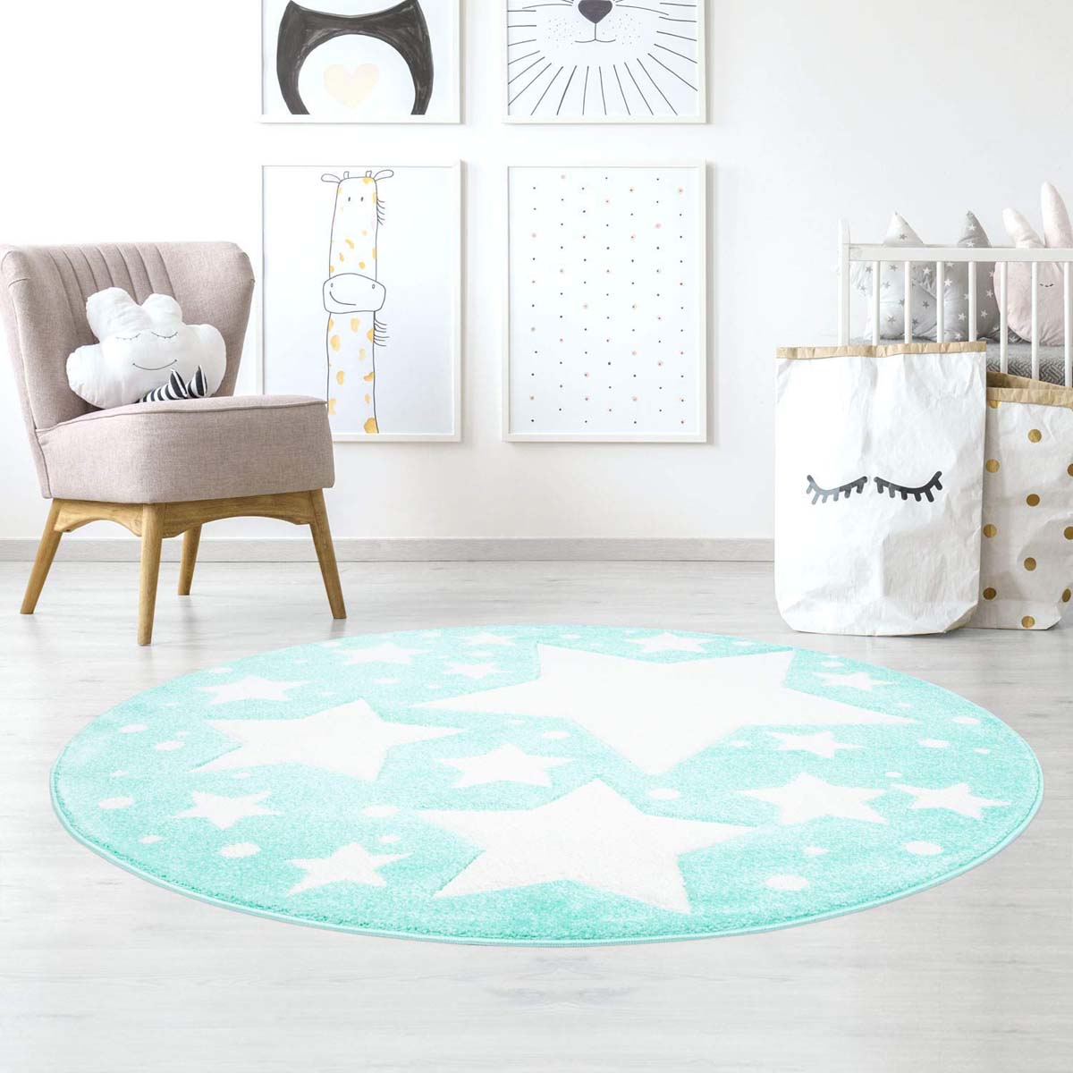 Tappeto bambini rotondo stelle – Stella blu menta/crema -29%